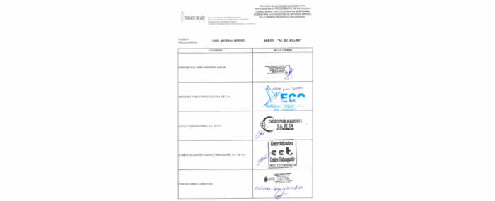 En otra licitación, convocada por la Secretaría de Educación de Tabasco, fechada a inicios de agosto de 2019, la propia dependencia tabasqueña invitó directamente a las empresas Choco Publicaciones y Comercializadora Centro Tabasqueño, las cuales según sus propias facturas y contratos, están establecidas también en la calle Tres, número 214, colonia Reforma.