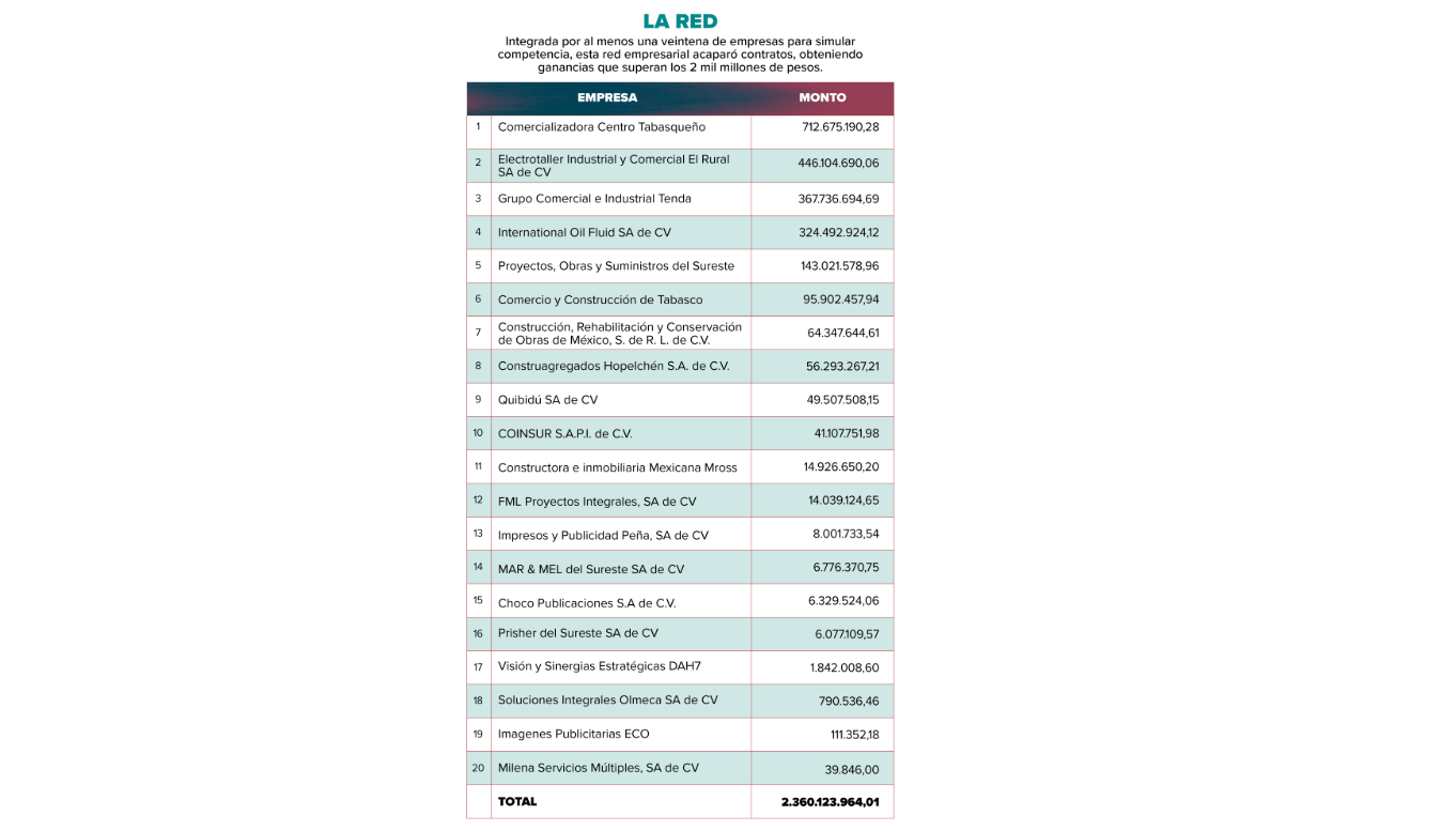 Esa práctica permitió la articulación de una red empresarial que simuló competencia para acaparar contratos. Algunas de las compañías se integraron en un entramado que creció durante el gobierno de Adán Augusto López en Tabasco y que después se extendió a por lo menos seis estados gobernados por Morena y al ámbito federal.