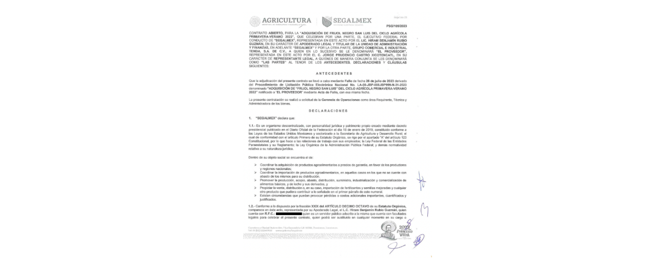 Pese a esos hallazgos, Segalmex volvió a contratar a la misma empresa. En un procedimiento distinto, cuyo fallo se emitió el 25 de julio de 2023, la dependencia adjudicó a Tenda el suministro de tres mil toneladas de frijol negro por 88 millones 300 mil pesos.