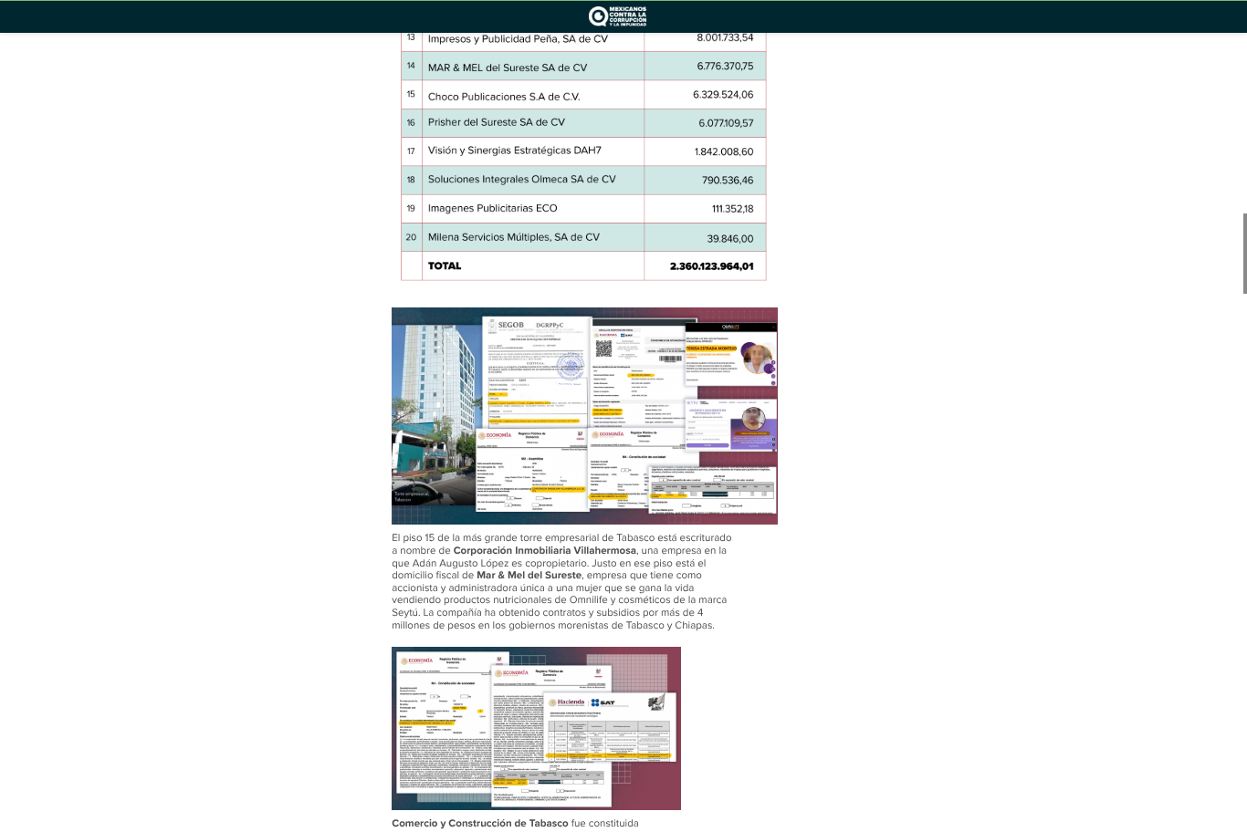 El piso 15 de la más grande torre empresarial de Tabasco está escriturado a nombre de Corporación Inmobiliaria Villahermosa, una empresa en la que Adán Augusto López es copropietario. Justo en ese piso está el domicilio fiscal de Mar & Mel del Sureste, empresa que tiene como accionista y administradora única a una mujer que se gana la vida vendiendo productos nutricionales de Omnilife y cosméticos de la marca Seytú. La compañía ha obtenido contratos y subsidios por más de 4 millones de pesos en los gobiernos morenistas de Tabasco y Chiapas.