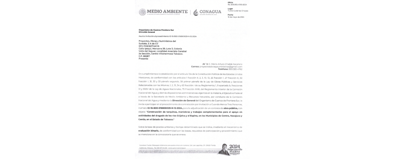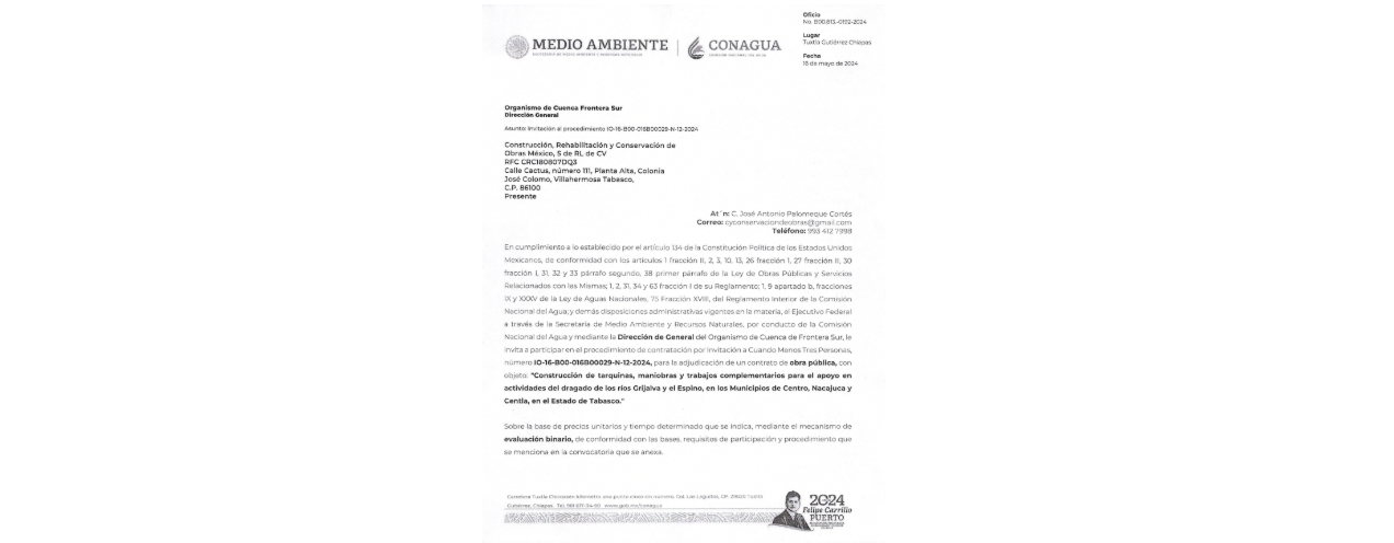 Por ejemplo, en un procedimiento del 16 de mayo de 2024 para actividades de limpieza de los ríos Grijalva y el Espino, la Comisión Nacional del Agua (Conagua) recibió ofertas de tres empresas vinculadas entre sí: Construcción, Rehabilitación y Conservación de Obras de México; Comercio y Construcción de Tabasco (empresa incluida por el SAT en su lista definitiva de factureras), y Proyectos, Obras y Suministros del Sureste.