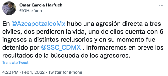 El secretario de Seguridad Ciudadana de la Ciudad de México, Omar García Harfuch, informó que se trató de una agresión directa a tres civiles, de los cuales dos perdieron la vida.