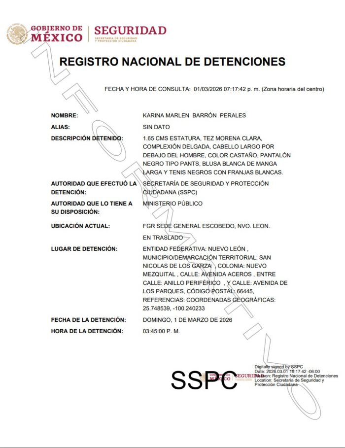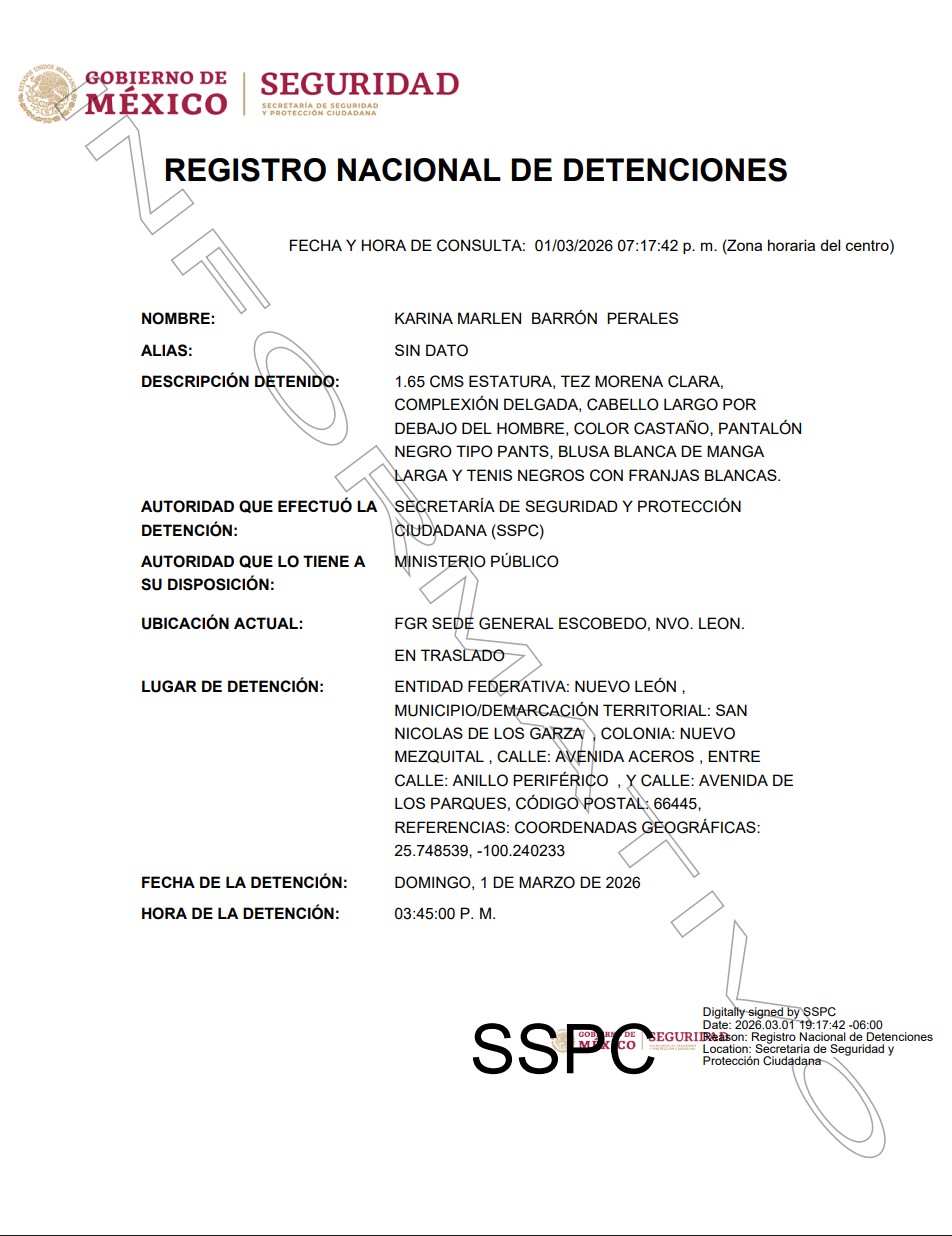 De acuerdo con el Registro Nacional de Detenciones, la detención de Barrón Perales se realizó en la avenida Aceros, en colonia Mezquital, en San Nicolás de los Garza, este domingo 1 de marzo a las 15:45 horas.