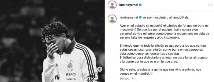 Desde su cuenta personal de Instagram Lamine Yamal afirmó ser musulmán, y refirió que los cánticos de “el que no bote es