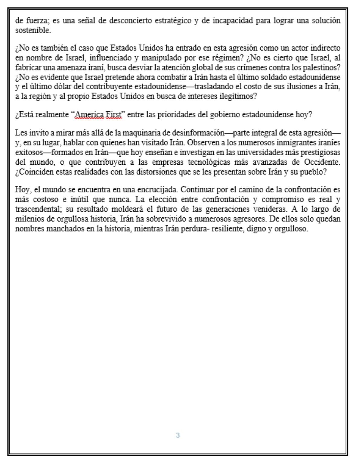Les invito a mirar más allá de la maquinaria de desinformación —parte integral de esta agresión— y, en su lugar, hablar con quienes han visitado Irán. Observen a los numerosos inmigrantes iraníes exitosos —formados en Irán— que hoy enseñan e investigan en las universidades más prestigiosas del mundo, o que contribuyen a las empresas tecnológicas más avanzadas de Occidente. ¿Coinciden estas realidades con las distorsiones que se les presentan sobre Irán y su pueblo?
