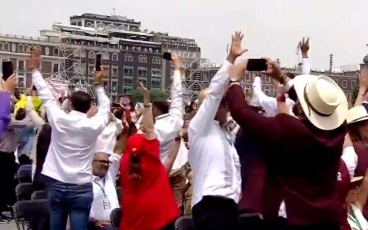 El presidente Andrés Manuel López Obrador aprovechó el acto para celebrar su Sexto Informe de Gobierno en el Zócalo capitalino para respaldar su propuesta de reforma judicial mediante una votación a mano alzada entre sus simpatizantes y enviar un mensaje a las autoridades de Estados Unidos para que respeten las decisiones que toma su gobierno.