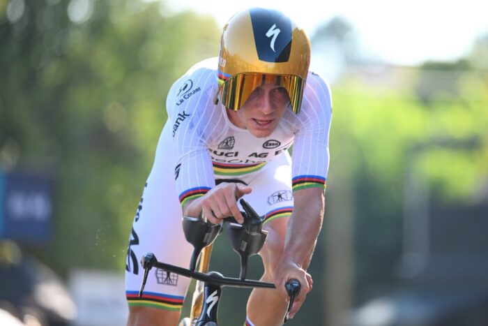 De esta forma, el belga consigue la triple corona en contrarreloj, con un tiempo total de 28:26 minutos, en una nueva exhibición, en la que terminó por delante del italiano Filippo Ganna y el danés Niklas Larsen, segundo y tercero, a 43 segundos y 1:08 minutos, respectivamente.