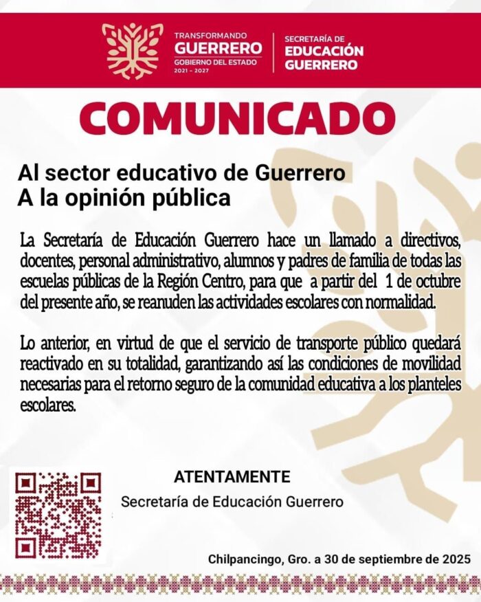 “La Secretaría de Educación Guerrero hace un llamado a directivos, docentes, personal administrativo, alumnos y padres de familia de todas las escuelas públicas de la Región Centro, para que a partir del 1 de octubre del presente año, se reanuden las actividades escolares con normalidad“.