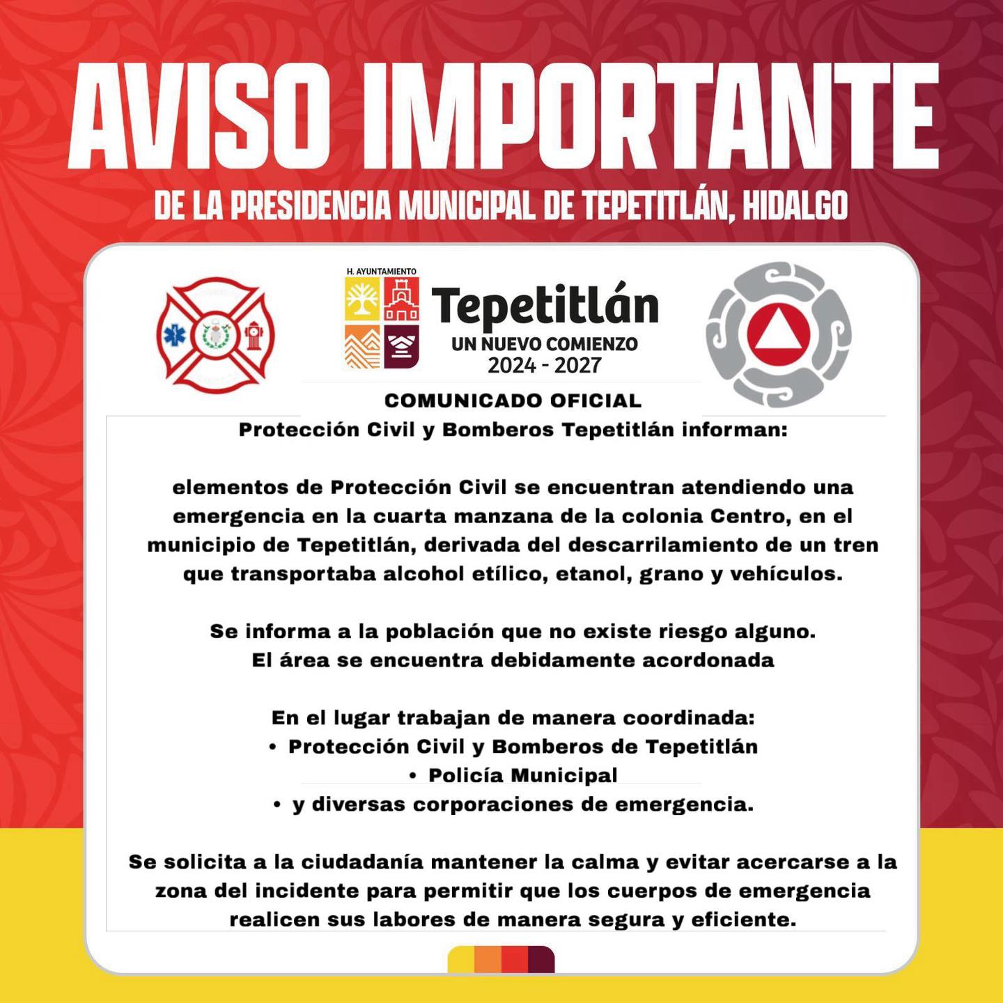 “El Gobierno Municipal de Tepetitlán informa que Protección Civil, Bomberos y Policía Municipal atienden de manera coordinada una emergencia derivada del descarrilamiento de un tren.