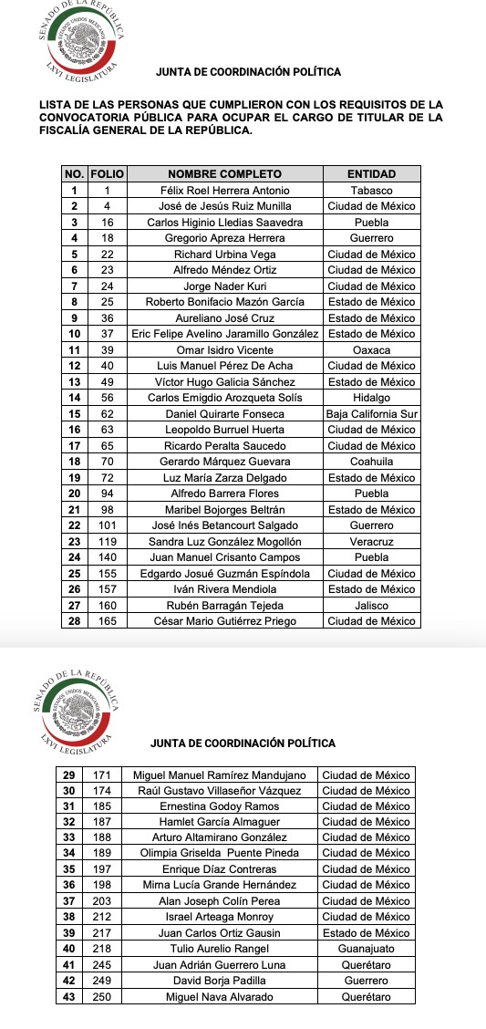 Añadió que a partir de la terna, la asamblea designará a la persona que ocupará la titularidad de la Fiscalía General de la República, quien deberá rendir la protesta de ley ante el Pleno senatorial.