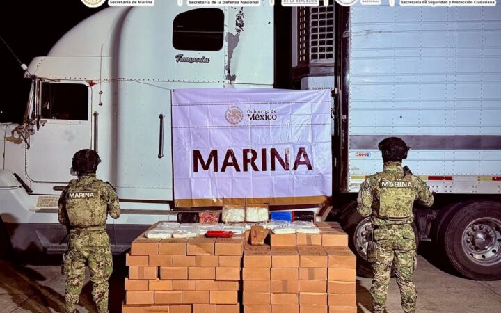 La Marina aseguró 626 kilos de droga, incluidos 605 kg de metanfetamina, en un tractocamión en el puerto de Mazatlán. El cargamento podría producir más de 15 millones de dosis.