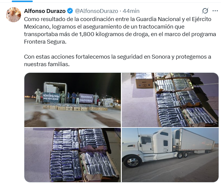 El gobernador de Sonora, Alfonso Durazo, informó que el aseguramiento de la droga entra en el marco del programa Frontera Segura.