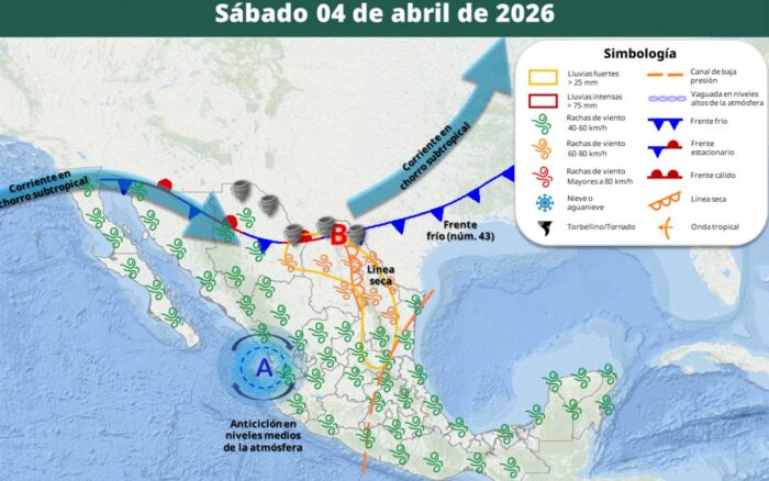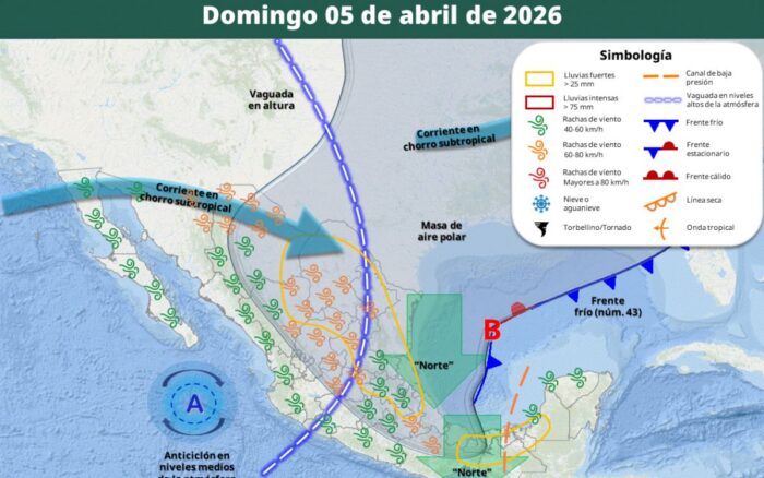 Para el domingo 5 de abril, el sistema frontal se desplazará sobre el litoral del Golfo de México, interactuando con un canal de baja presión y una masa de aire polar. Esta combinación generará descenso de temperatura sobre entidades del norte, noreste, oriente y centro de la República Mexicana; además de evento de Norte con rachas de viento de hasta 90 km/h en Tamaulipas, Veracruz e istmo y golfo de Tehuantepec.