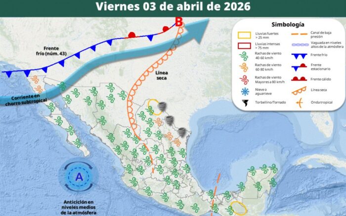 De acuerdo con el pronóstico extendido a 96 horas, el viernes 3 de abril se establecerá una línea seca en el noreste de la República, la cual originará viento con rachas de 50 a 70 km/h, chubascos y lluvias puntuales fuertes en Coahuila, Nuevo León y Tamaulipas. De manera simultánea, un nuevo sistema frontal ingresará por el noroeste durante la tarde, interactuando con la corriente en chorro subtropical. Este fenómeno provocará vientos de hasta 70 km/h en Baja California, Baja California Sur, Sonora y Chihuahua, mientras que en el litoral del Pacífico se registrará mar de fondo con oleaje de 1.5 a 2.5 metros de altura desde Jalisco hasta Chiapas.