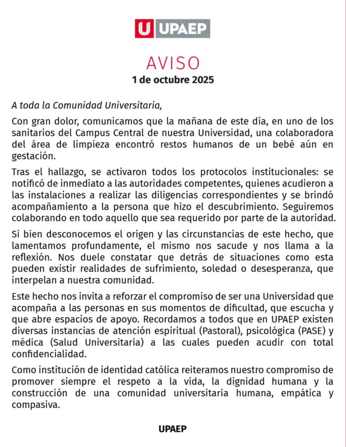 La Universidad Popular Autónoma del Estado de Puebla (UPAEP) informó, a través de un comunicado oficial, sobre la localización de restos humanos de un feto en un sanitario de su Campus Central.