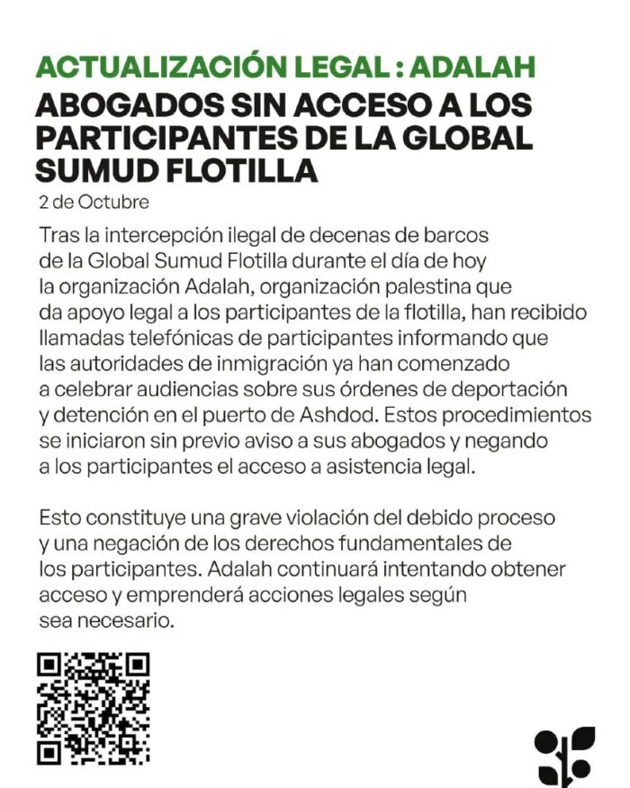 Luego de que embarcaciones de la Global Sumud Flotilla (GSF) fueron interceptadas por Israel, la organización palestina Adalah, que brinda apoyo legal a los participantes, informó que no ha podido estar presente en las audiencias que se celebran en el puerto de Ashdod.