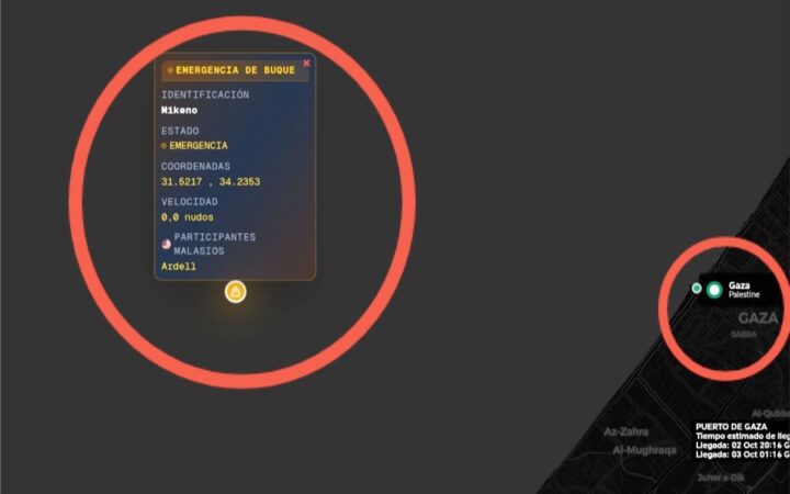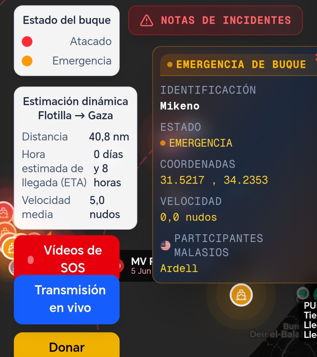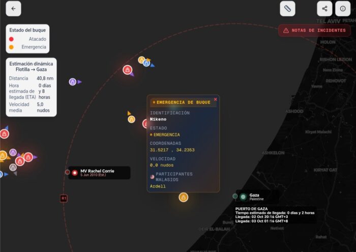 La plataforma precisa que Mikeno se encuentra a 25 kilómetros al sur de la costa de Gaza y podría llegar en cuestión de horas, aunque la nave se encuentra detenida.