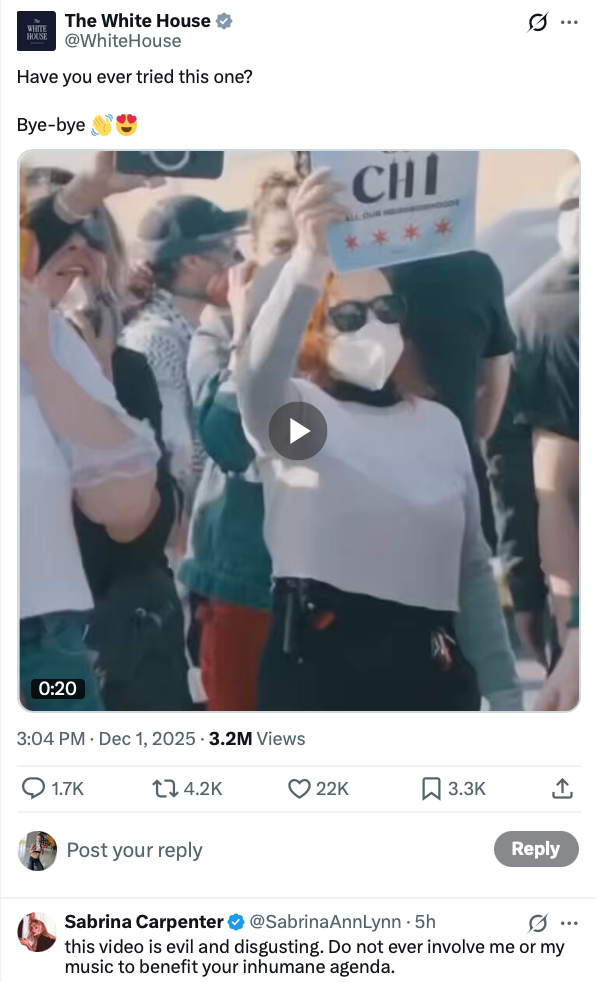 Sabrina Carpenter se lanzó contra el presidente Donald Trump y la Casa Blanca por utilizar una de sus canciones en un video que muestra redadas migratorias.