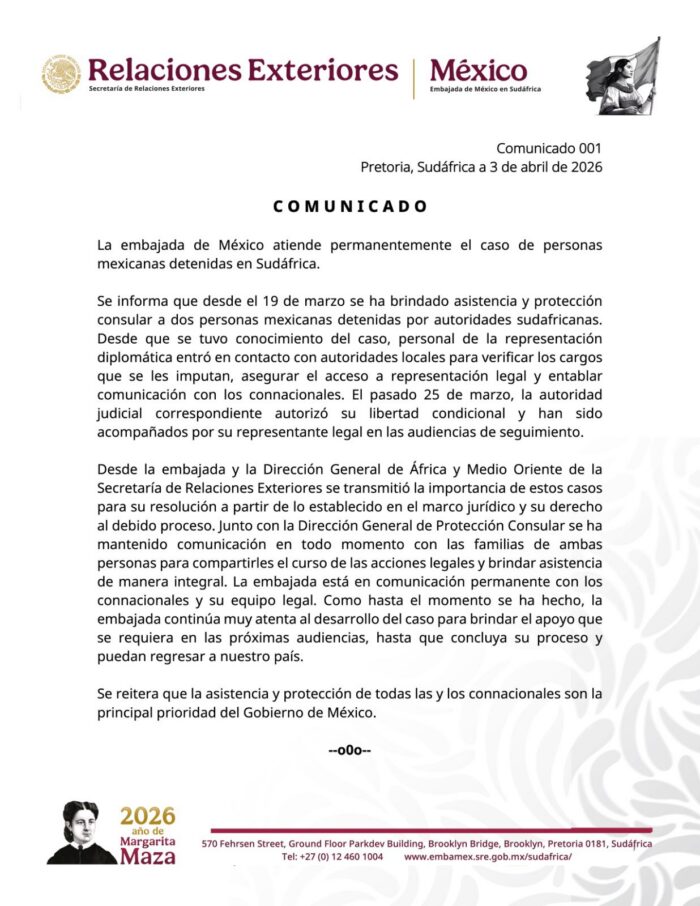 De acuerdo con el comunicado emitido por la representación diplomática en Pretoria, Sudáfrica, personal de la embajada estableció contacto con autoridades locales desde que se tuvo conocimiento del caso. El objetivo era verificar los cargos imputados, garantizar el acceso a representación legal y mantener comunicación directa con los connacionales.