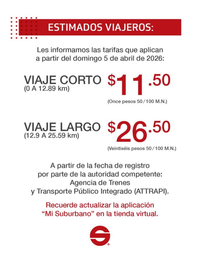 Ferrocarriles Suburbanos anunció que a partir del domingo 5 de abril de 2026 aumentará la tarifa del Tren Suburbano de la Zona Metropolitana del Valle de México.