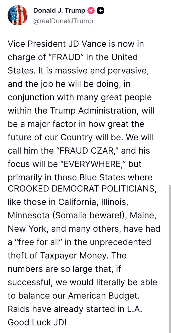 Trump señaló que Vance será el “zar del fraude” y aseguró que su equipo concentrará esfuerzos en estados gobernados por demócratas, como California, Illinois, Minnesota, Maine y Nueva York.