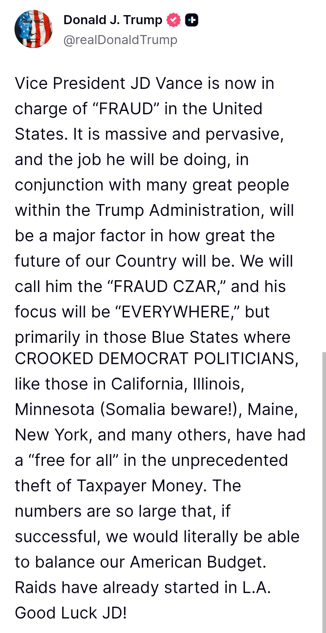 En otro momento, también en Truth Social, Trump anunció que el vicepresidente JD Vance encabezará una estrategia contra presuntos casos de fraude y mal uso de recursos públicos en su país.