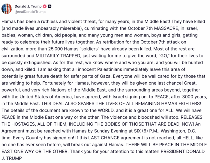 El acuerdo, que según dijo traerá la paz a la región después de 3,000 años, también “PERDONA LA VIDA DE TODOS LOS COMBATIENTES RESTANTES DE HAMAS. Les exijo, por tanto, que acepten el plan y que LIBEREN A TODOS LOS REHENES, INCLUYENDO LOS CUERPOS DE LOS MUERTOS, YA”.