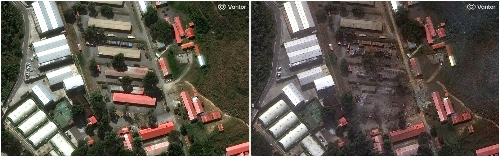 Imágenes satelitales de edificios y equipos militares en Fort Tiuna antes de los ataques estadounidenses, en Caracas, Venezuela, el 22 de diciembre de 2025 (izquierda), y una vista más cercana de los vehículos y equipos destruidos en Fort Tiuna después de los ataques estadounidenses, en Caracas, Venezuela, el 3 de enero de 2026 (derecha). Foto: Vantor/Handout vía Reuters