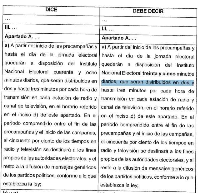 El tiempo disponible para el Instituto Nacional Electoral en radio y televisión durante los periodos de campañas electorales se reduce, pasando a ser de 35 minutos diarios.