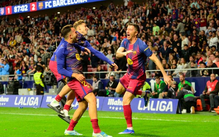 El FC Barcelona ha ganado este sábado por 1-2 en su visita al Atlético de Madrid en el Riyadh Air Metropolitano durante la jornada 30 de LaLiga EA Sports 2025-2026, en un partido que los blaugranas remontaron en los últimos compases con un gol con fortuna de Robert Lewandowski el gol inicial de Giuliano Simeone inmediatamente secundado por Marcus Rashford, ante un cuadro colchonero que jugó toda la segunda parte con un futbolista menos.