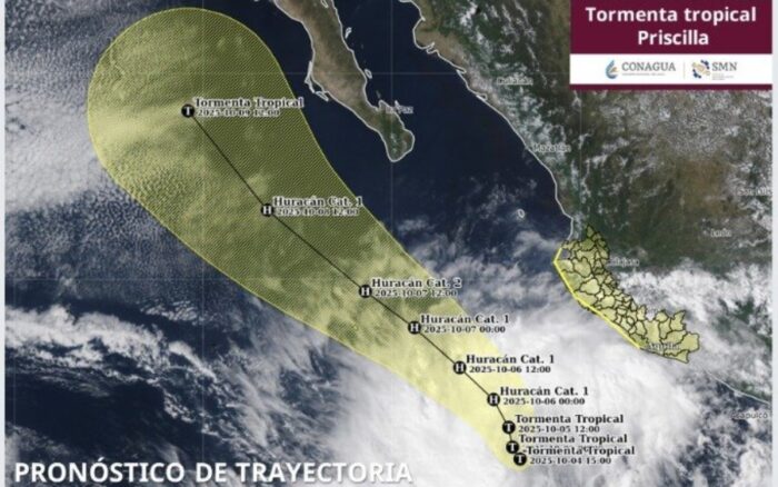 Según la trayectoria pronosticada, en los próximos días Priscilla “recorrerá paralelamente las costas del oeste del país” y entre la media noche del domingo y las primeras horas del lunes, podría intensificarse a huracán de categoría 1.