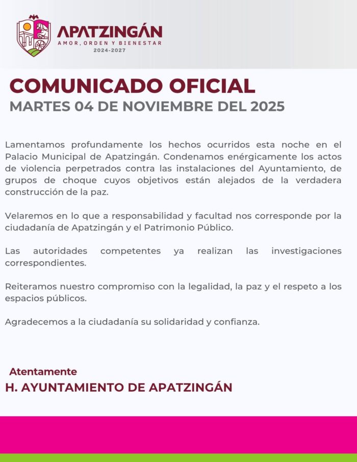 El Ayuntamiento de Apatzingán condenó los hechos de violencia registrados la noche de este martes en el Palacio Municipal, luego de que grupos desconocidos causaran daños en las instalaciones.