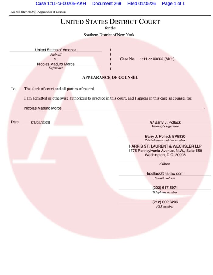 Aristegui Noticias confirmó que fue hoy cuando Barry J. Pollack, de la firma Harris St. Laurent & Wechsler LLP, tramitó ante la Corte de Distrito de los EE. UU. para el Distrito Sur de Nueva York la Comparecencia de Abogado (Appearance of Counsel) para presentarse como el abogado defensor de Nicolás Maduro.