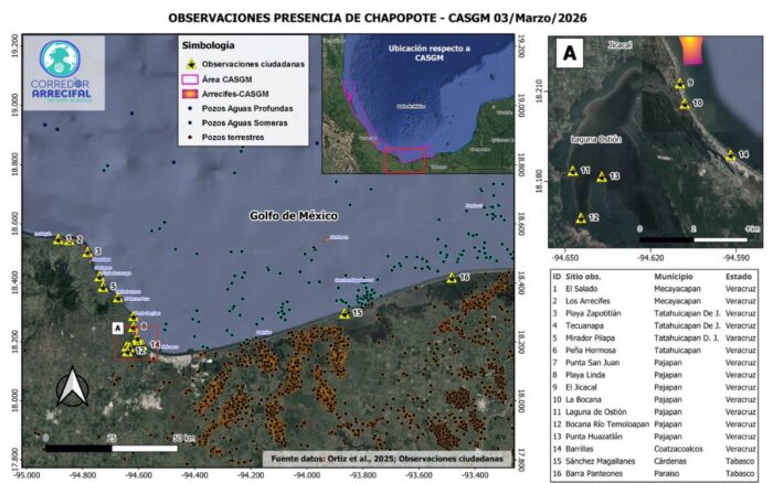 De acuerdo con un comunicado emitido por la Red Corredor Arrecifal del Golfo de México el 4 de marzo de 2026, la presencia de petróleo crudo y chapopote ha sido reportada en al menos 16 sitios desde el pasado domingo 1 de marzo, afectando playas y sistemas lagunares críticos para la biodiversidad y la economía regional.