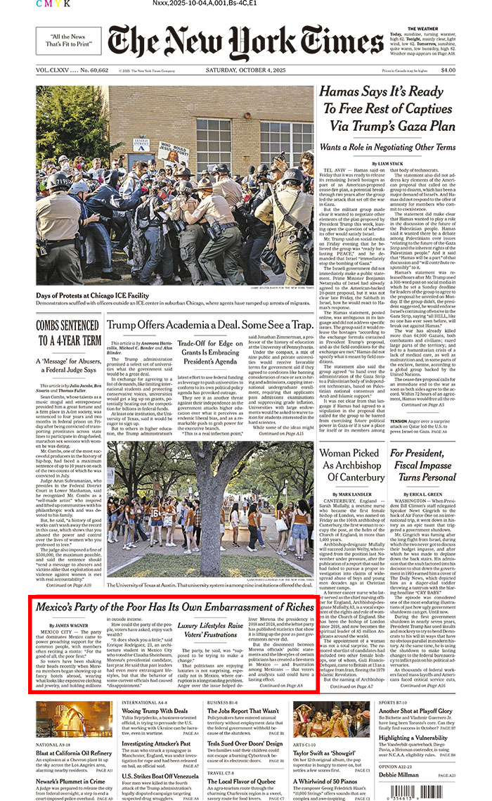 El texto, titulado “Una vergüenza de riquezas para el partido de los pobres en México” fue publicado en la portada de la edición impresa del diario este sábado y está firmado por el periodista James Wagner.