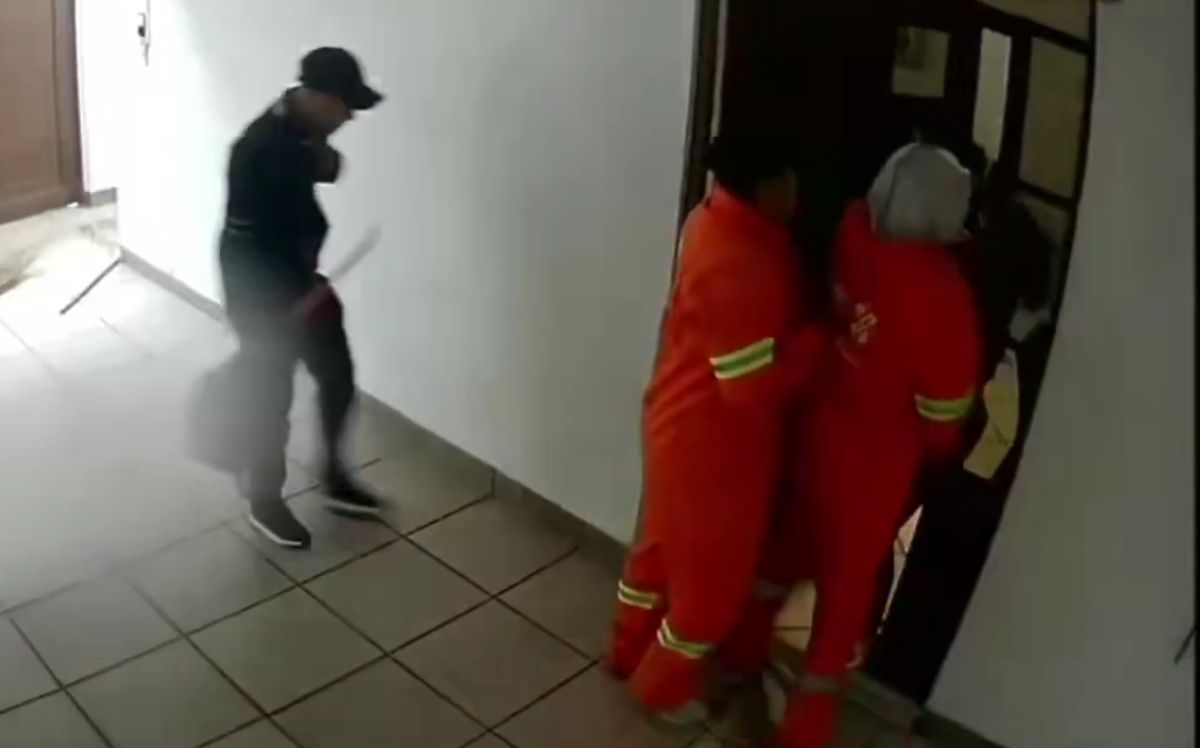 El video muestra que, cuando la víctima abrió la puerta del domicilio, uno de los sujetos que vestía uniforme naranja simulando ser trabajador de limpia la sometió por la espalda con un arma de fuego y la obligó a ingresar a la vivienda.