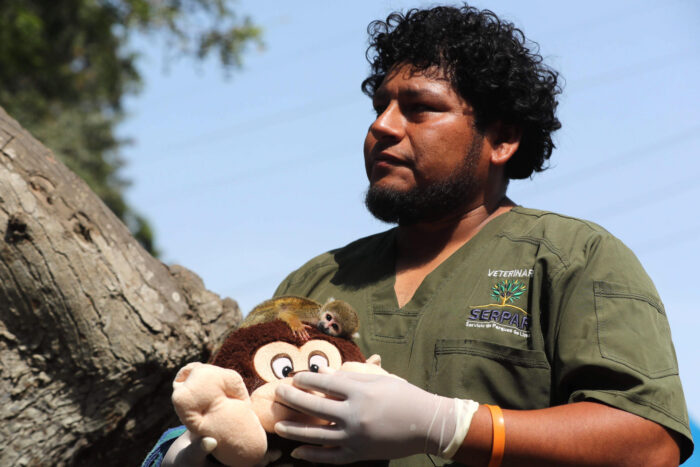 El pequeño Punch, que fue rescatado el viernes pasado en la capital de Perú con un peso de 90 gramos, “se encontraba deshidratado, en malas condiciones y poco a poco se ha ido recuperando”, explica a EFE el veterinario de fauna silvestre del Club Metropolitano Huáscar, en el sur de Lima, Julio Carrión con Punch en las manos.