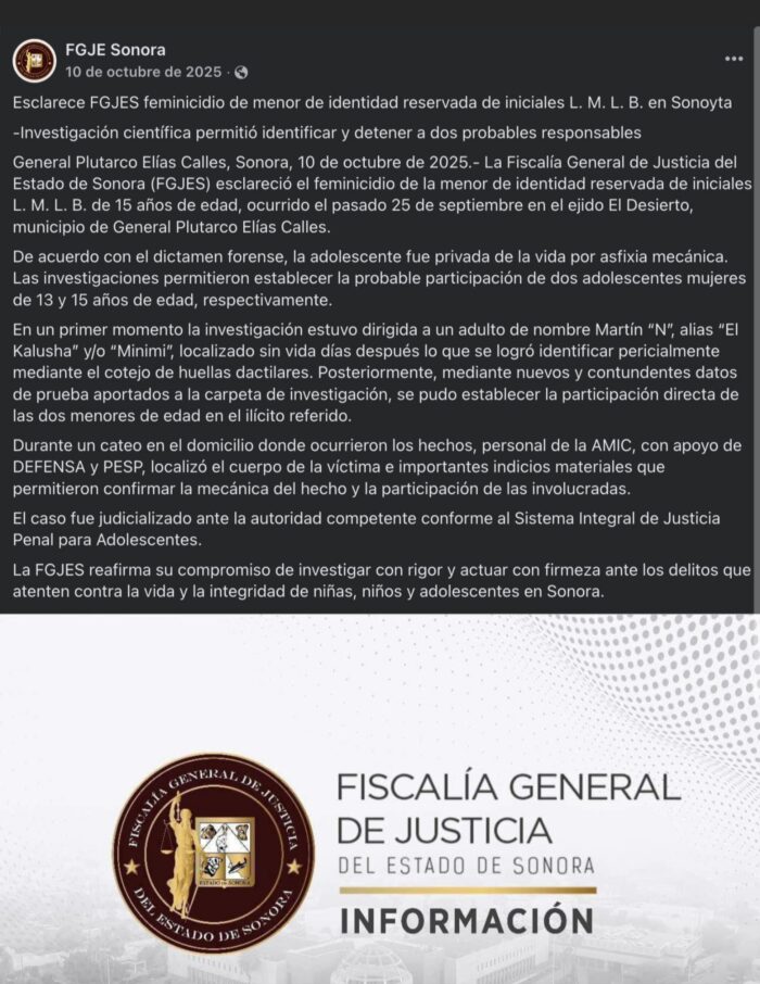 Los hechos se remontan al 25 de septiembre de 2025, fecha en la que se reportó la desaparición de la víctima en el ejido El Desierto. Tras una semana de búsqueda, la Fiscalía General de Justicia del Estado de Sonora confirmó el hallazgo del cuerpo de la joven el 2 de octubre, enterrado en el patio de una vivienda.
