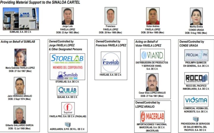 De acuerdo con el comunicado oficial, la red sancionada opera desde Culiacán, Sinaloa, y que su núcleo empresarial se articuló en torno a Sumilab, S.A. de C.V., compañía de equipos y suministros de laboratorio fundada en 2001 y ya previamente designada por OFAC en mayo de 2023. La autoridad estadounidense atribuye a Sumilab y a integrantes de la familia Favela López la provisión y el envío de sustancias químicas y equipo para operadores y laboratorios asociados al Cártel de Sinaloa.