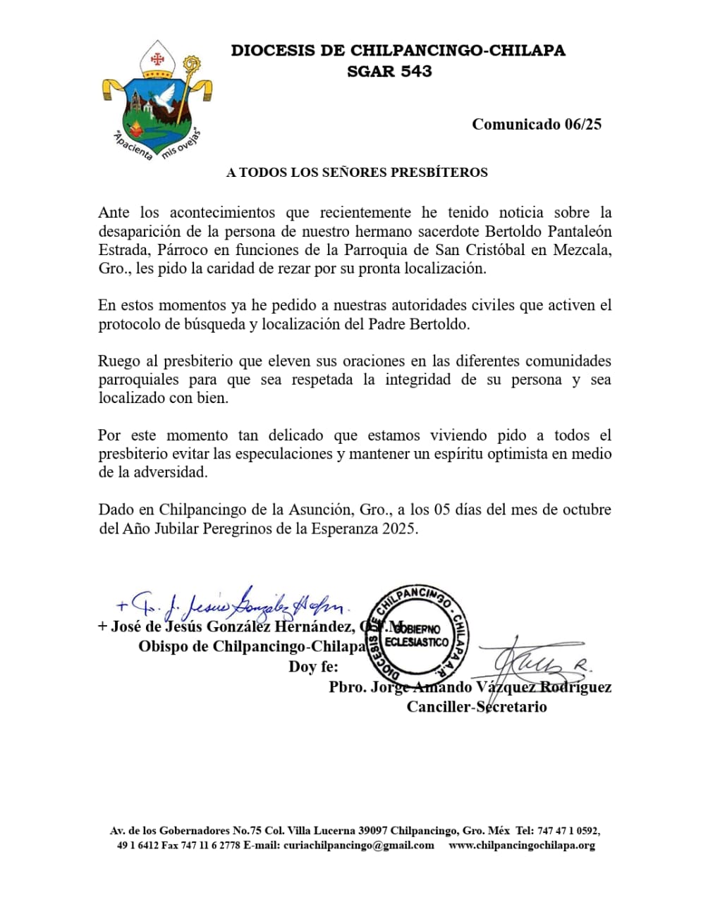 El comunicado, identificado con el número SGAR 543/06-25, fue emitido desde Chilpancingo de la Asunción en el marco del Año Jubilar Peregrinos de la Esperanza 2025* y certificado por el canciller-secretario de la diócesis, el presbítero Jorge Amando Vázquez Rodríguez.
