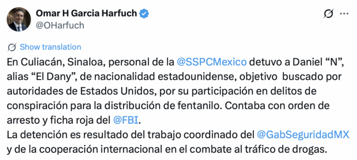 En una publicación en redes sociales, el funcionario detalló que el individuo, de nacionalidad estadounidense, contaba con una orden de arresto y ficha roja por parte del FBI, y su detención en territorio mexicano fue fruto del “trabajo coordinado” de Gabinete de Seguridad y de la cooperación internacional en el combate al tráfico de drogas.