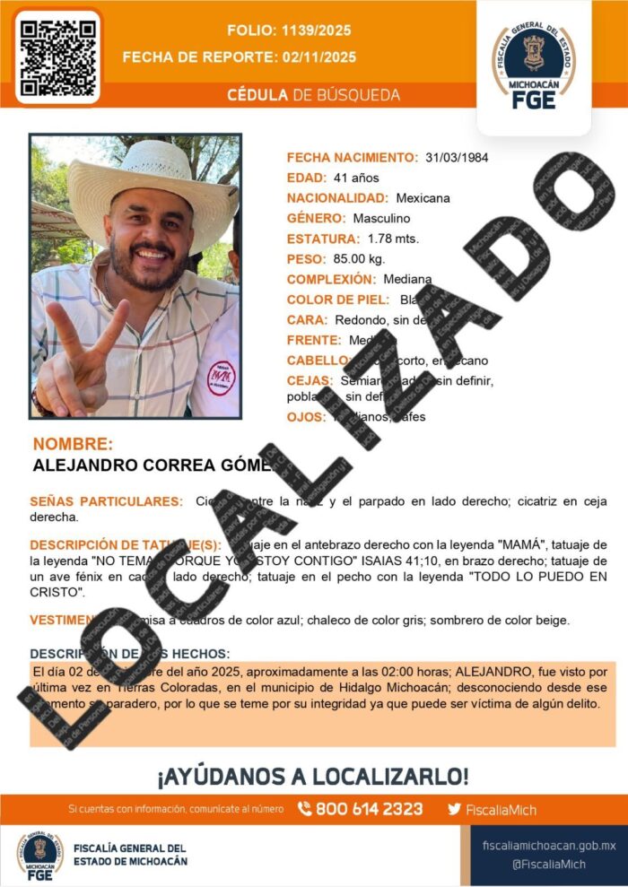 La Fiscalía General de Michoacán publicó en redes sociales la ficha de búsqueda de Correa Gómez con la leyenda “localizado”, pero no ofreció más detalles.