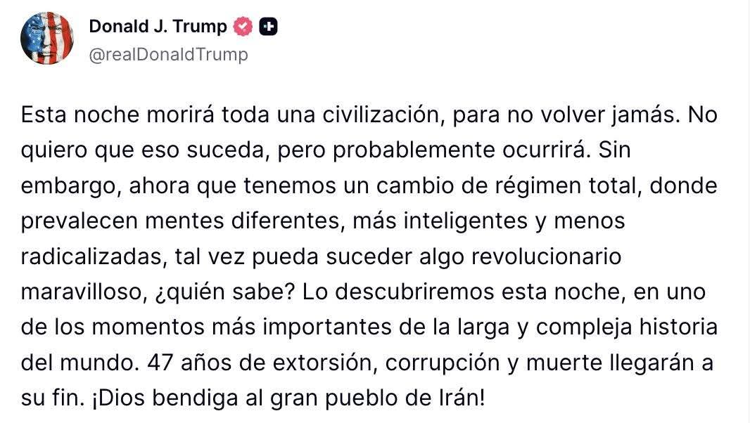 Te puede interesar > Trump afirma que ‘toda una civilización morirá esta noche, para nunca volver’, a horas del fin de su ultimátum a Irán