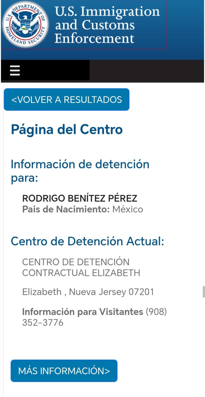 De acuerdo con información del ICE, el exfuncionario permanece recluido en el Centro de Detención Contractual Elizabeth, en la ciudad de Elizabeth, Nueva Jersey.