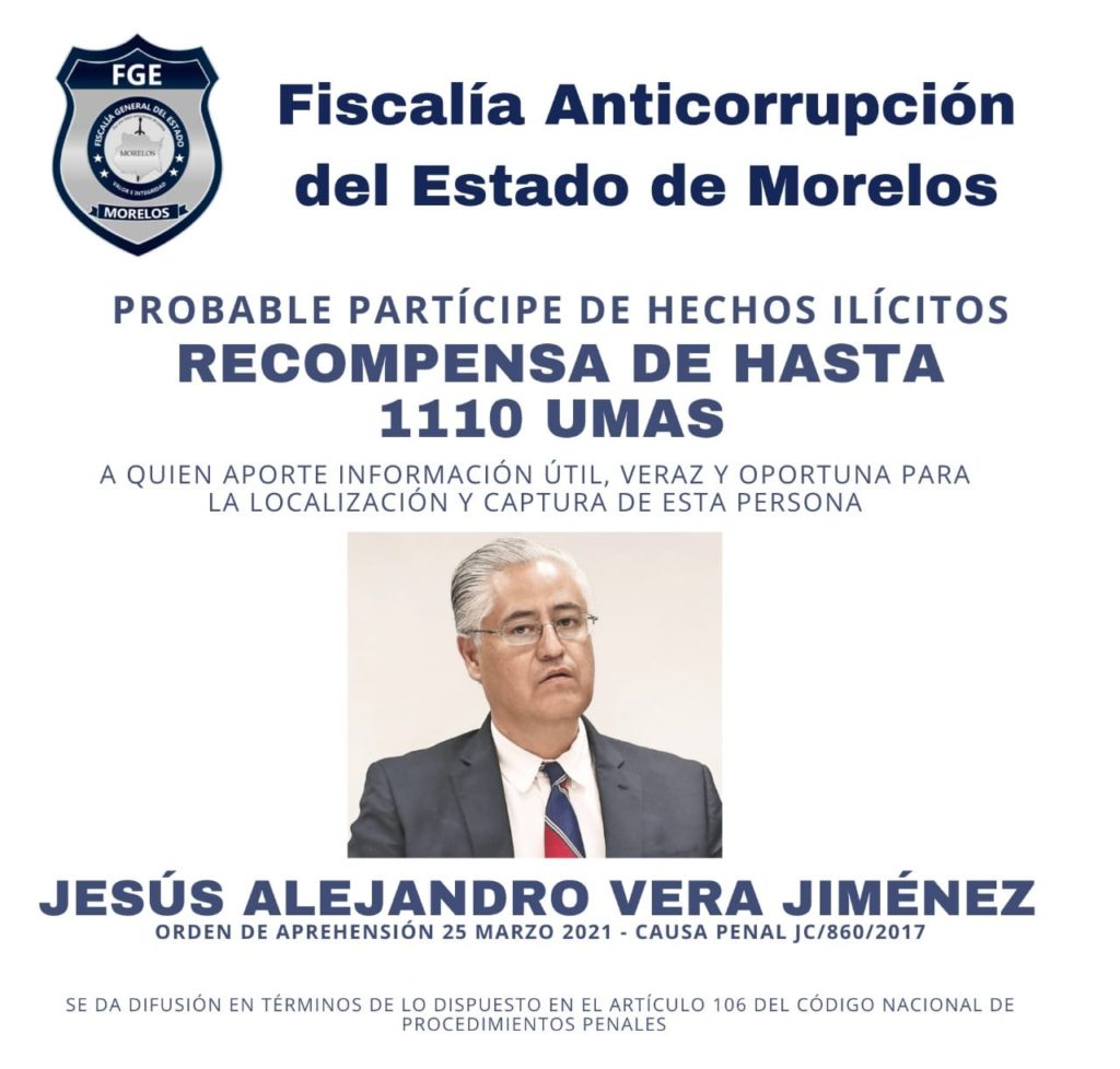 Cabe recordar que la Fiscalía Anticorrupción del Estado de Morelos difundió, en marzo de 2021, una ficha informativa en la que identificó a Jesús Alejandro Vera Jiménez como probable partícipe de hechos ilícitos, ofreciendo una recompensa de hasta 1,110 UMAS a quien aportara información útil y veraz que condujera a su localización, dentro de la causa penal JC/860/2017.