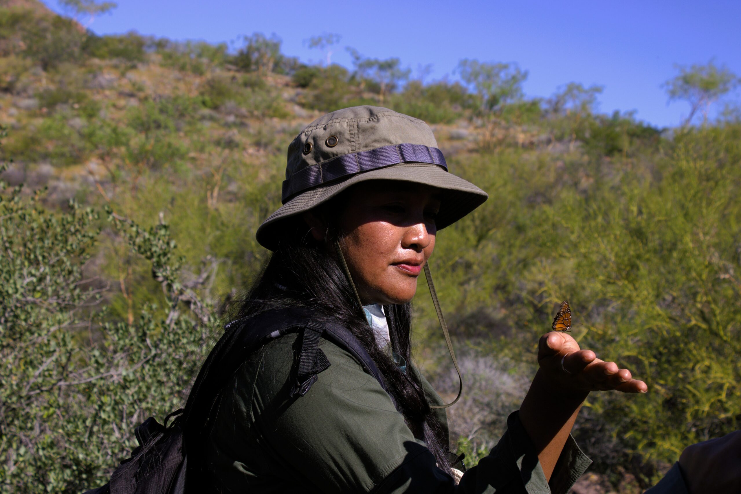 Erika Barnett la mira a través del plástico, tratando de descifrar los dibujos que las finas venas negras trazan en sus alas. “¿Será una mariposa monarca?”, se pregunta la representante de los monitores comunitarios comcáac que lidera la visita de campo. Luego corrige: “No, no tiene las venas gruesas; es una mariposa reina (Danaus gilippus)”, dice sobre una de las especies más parecidas a la Danaus plexippus, la mariposa que buscan encontrar.