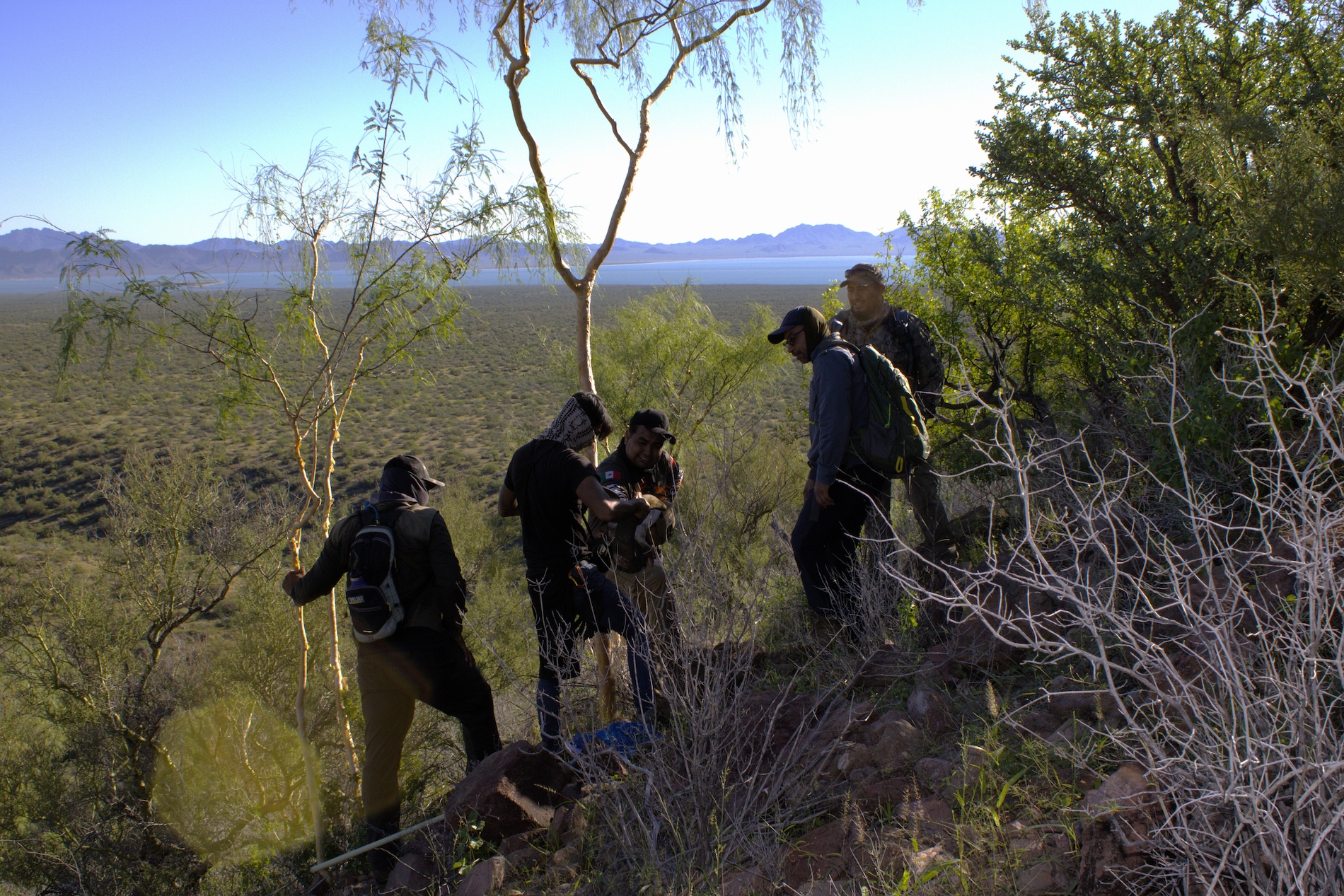 Personal de CCC y del IBUNAM, con miembros de la comunidad comcáac en búsqueda de mariposa monarca y Asclepias. Foto: cortesía Arantxa Peralta García / IBUNAM – CCC para Mongabay Latam.