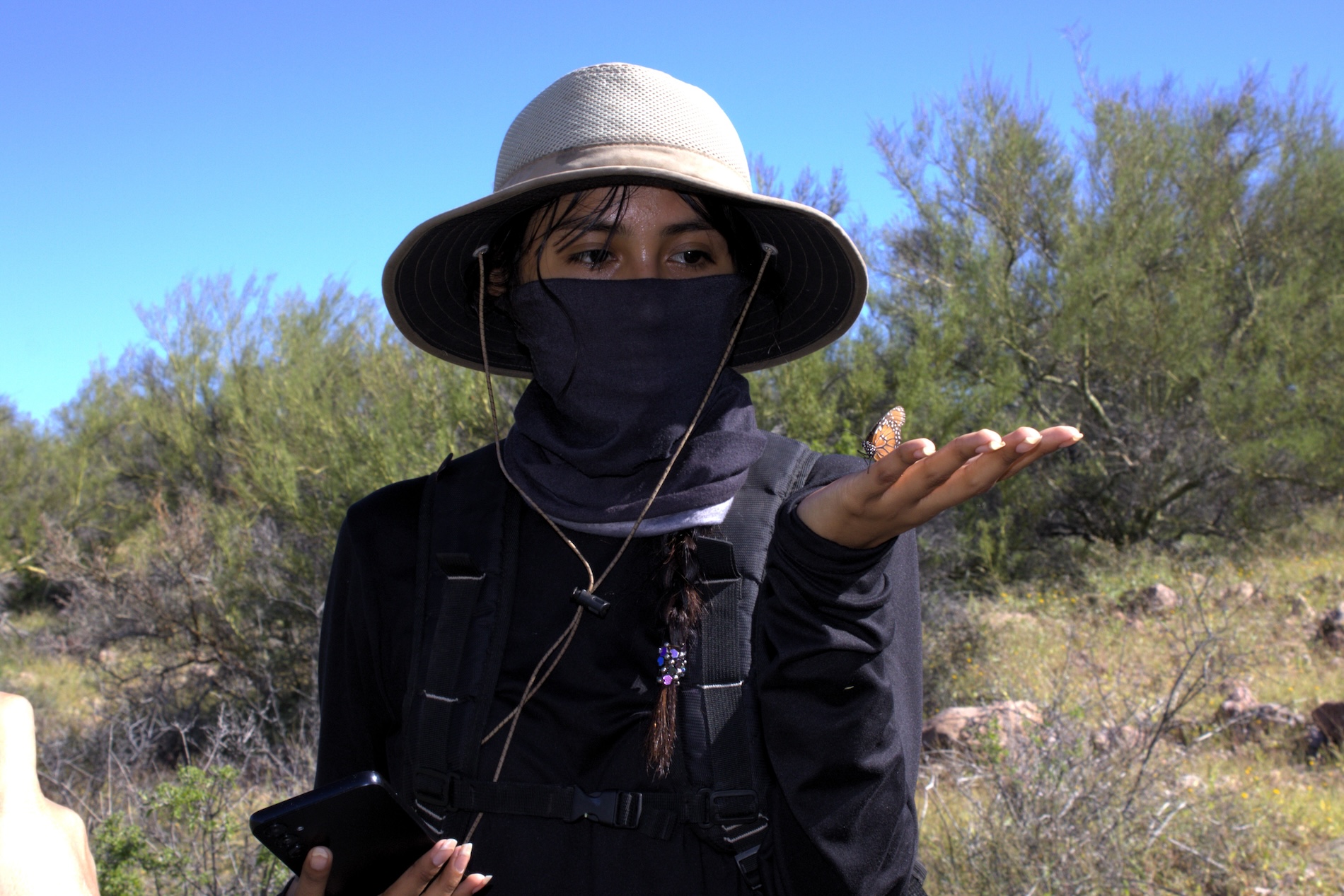 Alissa López Barnett, participante de la comunidad comcáac en el proyecto científico, muestra una mariposa reina (Danaus gilippus ssp). Foto: cortesía Arantxa Peralta García / IBUNAM – CCC para Mongabay Latam.
