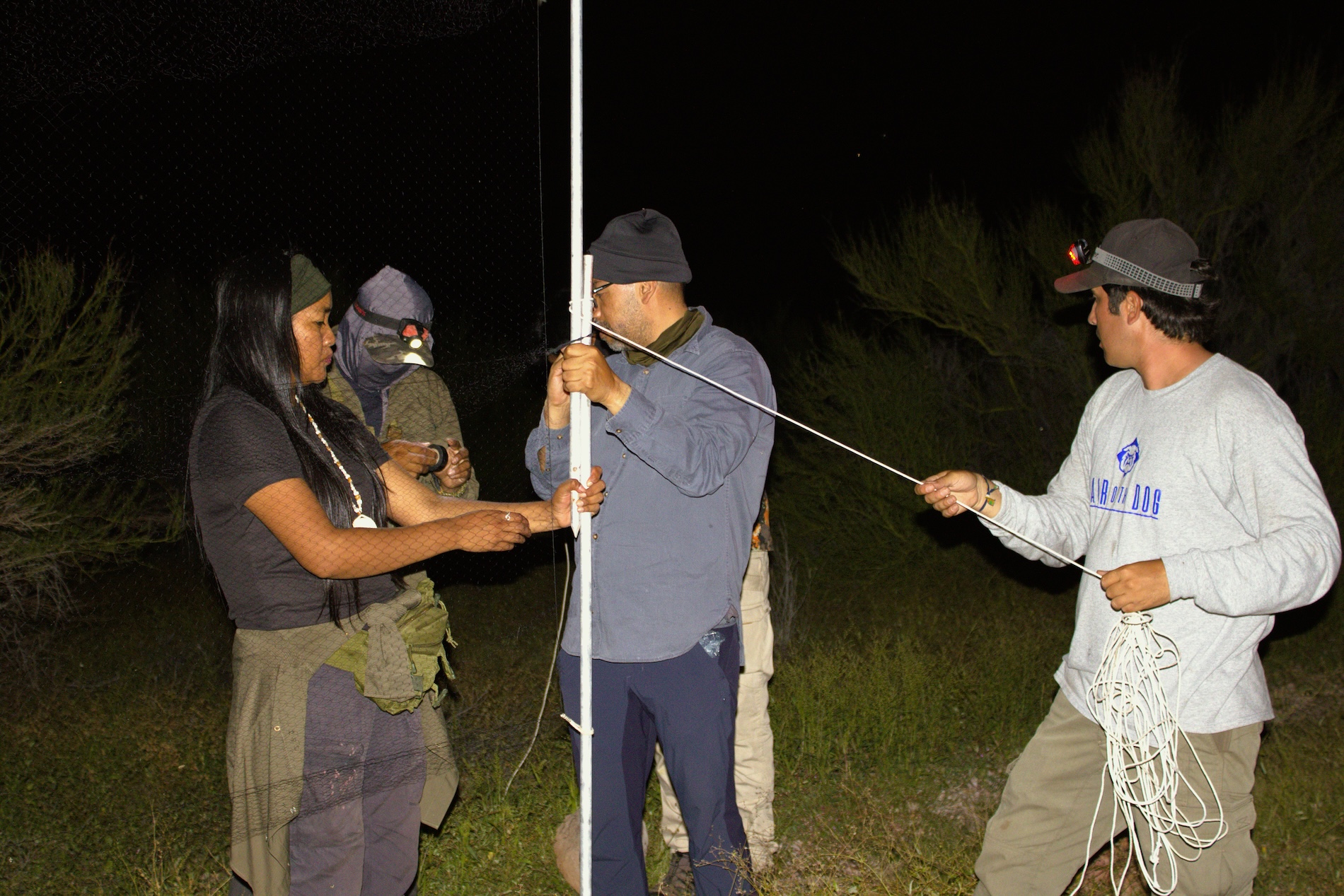 Personal de la Conanp y del IBUNAM explican ante miembros de la comunidad comcáac cómo colocar redes niebla para la captura de murciélagos. Foto: cortesía Arantxa Peralta García / IBUNAM – CCC para Mongabay Latam.