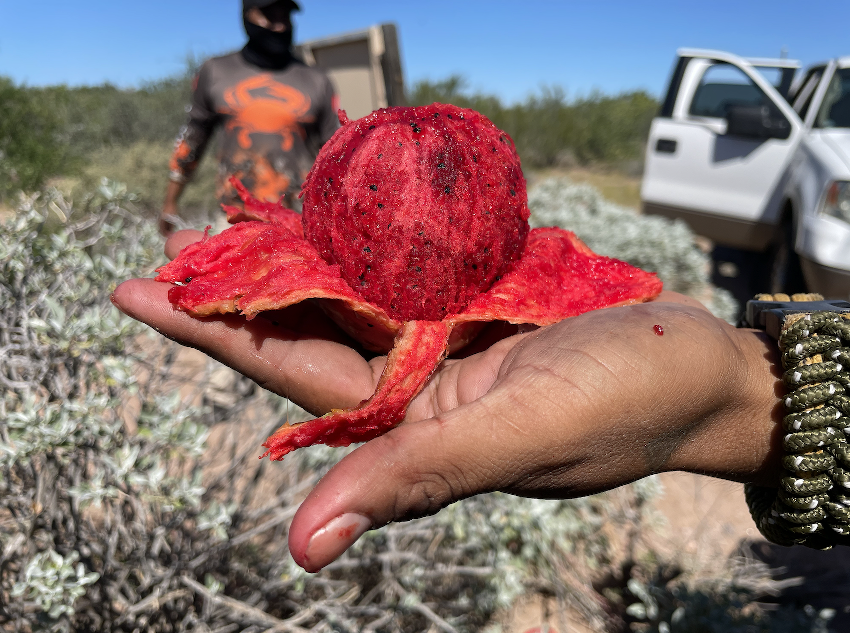 Ahora, Maximiliano López Romero, sobrino de Humberto Romero y quién siguió sus pasos en la botánica, fue quien guió al grupo comcáac e investigadores hasta el encuentro con estas plantas. Hubo que caminar entre rocas y pequeños senderos repletos de vegetación para llegar hasta un valle con pasto, rodeado de cerros.